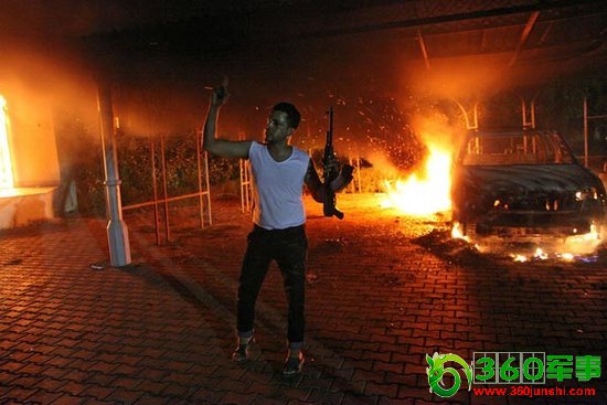 当地时间11日晚上,利比亚班加西美国领事馆内,一名男子挥舞着枪支。当日,数十名利比亚示威者冲进美国在班加西的领事馆内,将多处建筑点燃